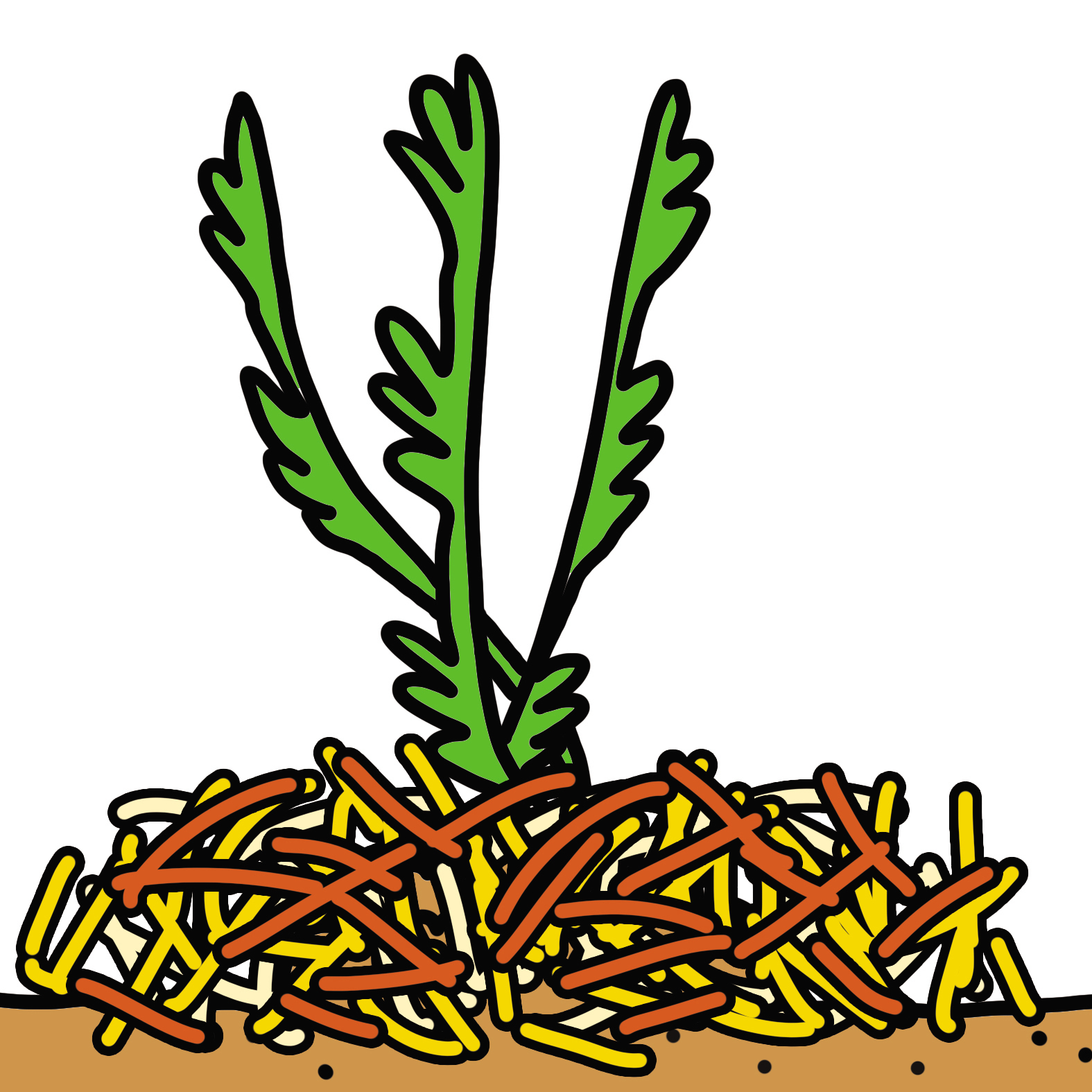 Disposez un épais paillage organique carboné (feuilles mortes, paille, bois broyé) sur 20 à 30 cm d'épaisseur tout autour de la plante. C'est le volume d'air emprisonné dans ce paillis qui assure l'isolation. Laissez toujours le centre de la plante libre.