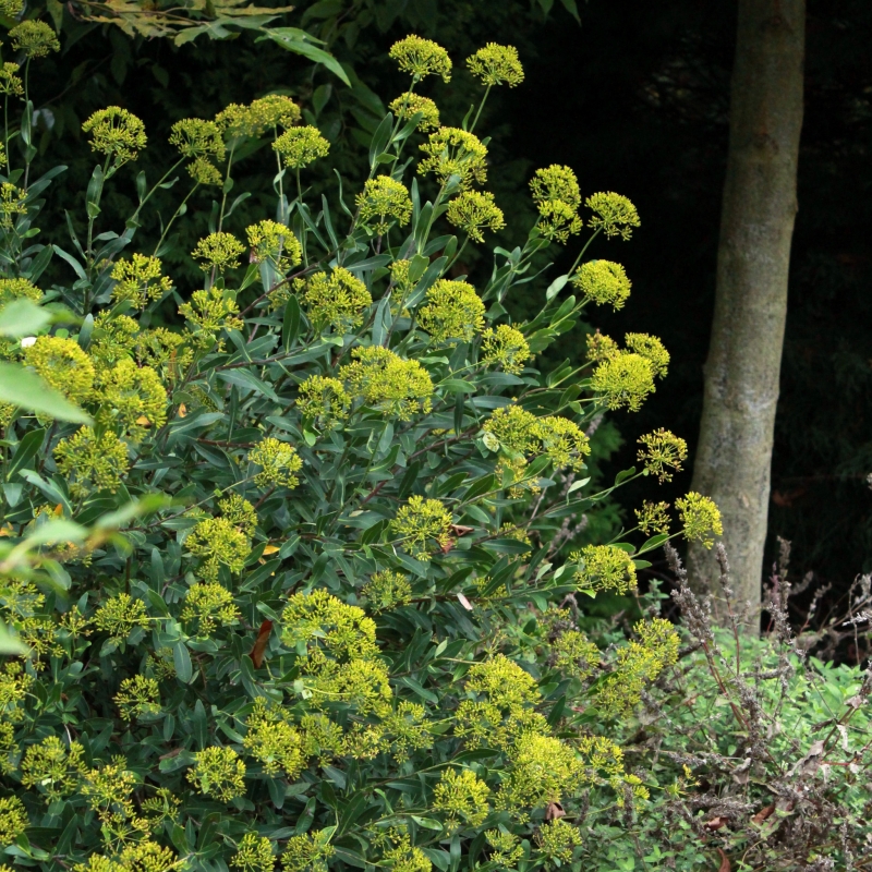 L'automne est la meilleure période pour planter les arbustes et les arbrisseaux à feuillage persistant. En effet la terre, encore chaude, induit un pré-enracinement rapide qui favorise la reprise au printemps suivant. C'est donc le moment de planter le buplèvre arbustif, (Bupleurum fruticosum), increvable arbrisseau au feuillage vert foncé et lustré, grand adepte de la chaleur et de la sécheresse. Sa rusticité (- 12 °C) lui ouvre les portes de bien des jardins, dès lors qu'on l'installe à exposition ensoleillée, dans un sol drainant qui évitera la stagnation de l'eau durant l'hiver. De juillet à septembre, il se couvre d'ombelles de fleurs jaune-vert, ressemblant à celles du fenouil, contrastant superbement avec le feuillage foncé. Au bout de quelques années, il peut atteindre 180 cm de hauteur et servir de brise-vue semi-opaque.