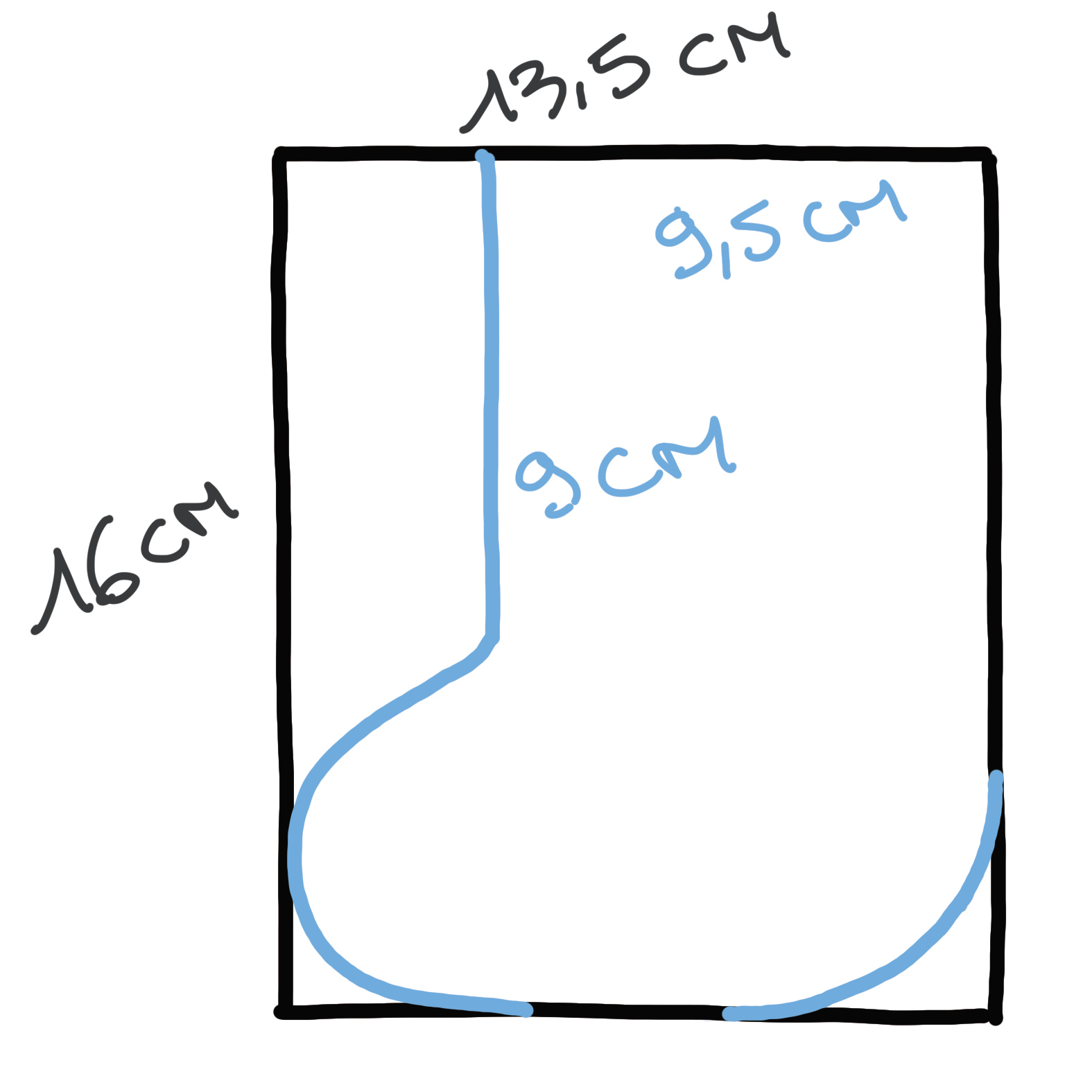 Sur une feuille de papier, tracez un rectangle de 13,5 x 16 cm, puis une ligne de 9 cm du côté droit. Ce repère marque l'ouverture de la botte. Dessinez-la, puis découpez le patron.