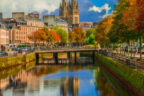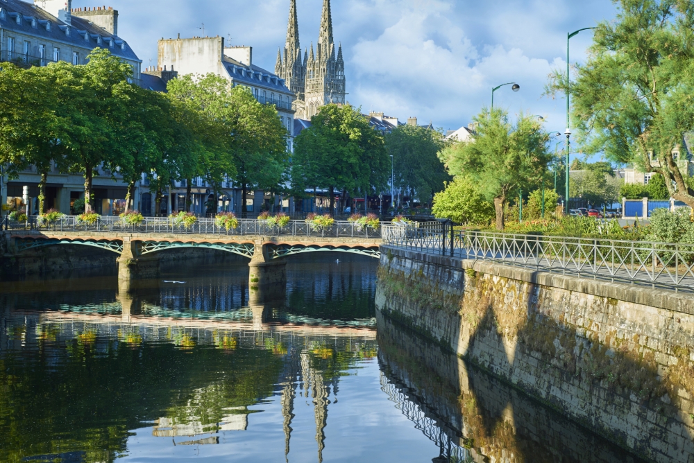Surnommée la « petite Venise », Quimper peut se targuer de se trouver à la croisée de deux affluents, le Steïr et l'Odet. À pied ou à vélo, flânez dans le centre pour découvrir ses rues pavées, ses passerelles et la cathédrale Saint-Corentin, construite en 1239 et dédiée au premier évêque légendaire de Cornouaille.