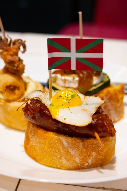 Pour éveiller vos papilles, faites la tournée des bars pour grignoter les célèbres tapas appelées « pintxos » (dérivé du basque « pinchar », qui signifie « piquer », car ces petites bouchées sont présentées avec des cure-dents). Elles sont composées d'une tranche de pain, sur laquelle reposent plusieurs aliments locaux comme du « solomillo », un petit morceau de filet de bœuf, de la « ropa vieja », comprenez du porc effiloché mais aussi du foie gras, des anchois, des olives, des « guindillas » (petits piments) ou encore des poivrons farcis. D'autres « pintxos » plus classiques sont également de la partie comme les croquettes au jambon, les patatas bravas, les moules, les Saint-Jacques à la plancha, etc.