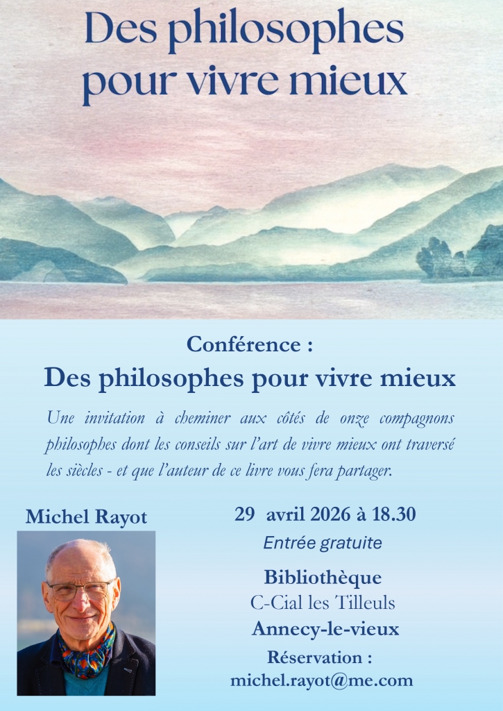 Inspirée du livre de Michel Rayot qui a une origine profondément émotionnelle, cette conférence trace un parcours accessible et vivant à travers 24 siècles de pensée, en compagnie de onze grands philosophes, parmi lesquels entre autres, les Stoïciens.