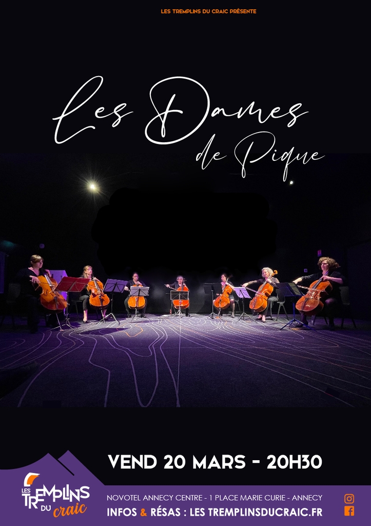 Sous la direction de M.F. Nageotte et constitué par un ensemble de violoncellistes de l’Orchestre Symphonique Musique en fêtes, les Dames de Pique proposent un programme varié, touchant à la fois la musique classique, traditionnelle et contemporaine.