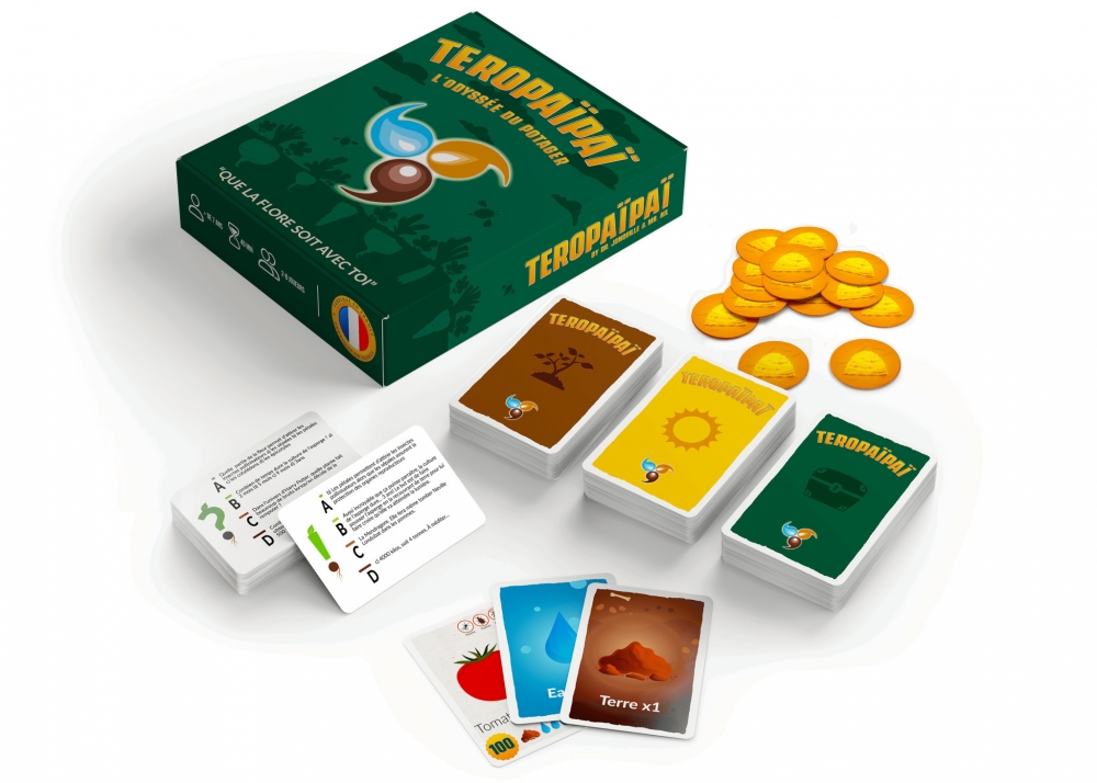 Teropaïpaï est un jeu de société qui vous fera vivre en famille une aventure palpitante, drôle et éducative sur le thème du jardinage. Figurez-vous que vous venez d'acquérir un petit lopin de terre et, pour subvenir à vos besoins, vous devez créer un potager. Vous avez un objectif : transformer vos cartes graines en cartes plantes en utilisant le maximum de ressources naturelles à votre disposition. Attention cependant, si la nature est souvent clémente, elle peut aussi être capricieuse, et il faut alors faire face aux imprévus. Sans compter sur vos adversaires jardiniers, qui ne manqueront pas une occasion de vous couper l'herbe sous le pied. Un jeu de société malin qui aborde tous les thèmes du jardinage bio : association de cultures, auxiliaires et ravageurs, arrosage, paillage. De quoi sensibiliser les graines de jardinier à la culture biologique !