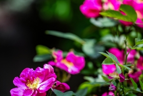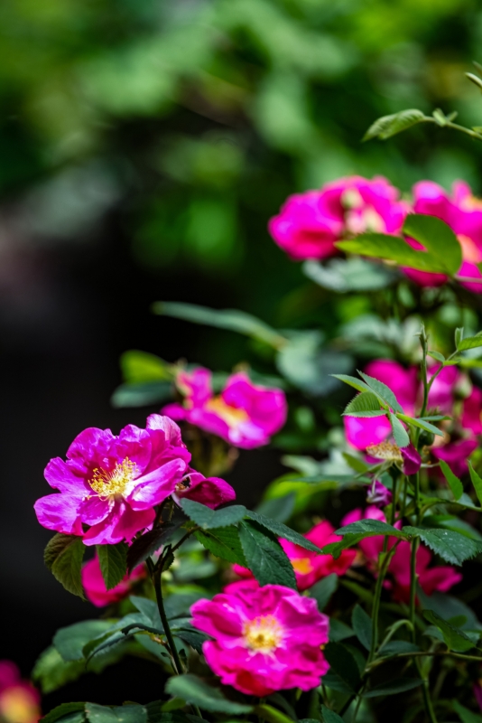 Cette robustesse n'exclut cependant pas la finesse. Le rugosa déploie ses premières fleurs dès la fin mai et continue de fleurir inlassablement jusqu'aux premières gelées. Il est donc remontant, ce qui est plutôt rare pour un rosier botanique. Ses fleurs simples ou semi-doubles ne font pas dans l'exubérance, mais elles sont à la fois colorées, le plus souvent dans des tons de rose magenta, et parfumées, avec d'étonnantes notes épicées de clou de girofle. Il existe néanmoins de nombreuses variétés qui élargissent le prisme des couleurs, du violet au pourpre et du rose jusqu'au blanc.
