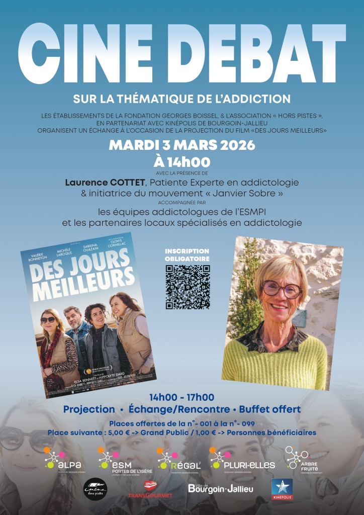Un ciné débat sur la thématique de l'addiction est organisé par les établissements de la fondation Georges Boissel et l'association "Hors Pistes", en partenariat avec le cinéma Kinépolis de Bourgoin-Jallieu.