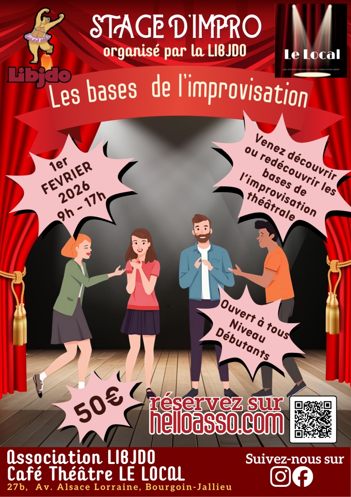 Que vous soyez débutants, ou déjà comédien(ne) d'impro, venez découvrir ou redécouvrir les bases de l'improvisation théâtrale avec notre stage intensif de 6 heures, axé sur l'écoute, l'acceptation, la mise en valeur, le lâcher-prise et la cohésion, pour créer des histoires spontanées et captivantes en travaillant sur le qui, quoi, où et les relations.