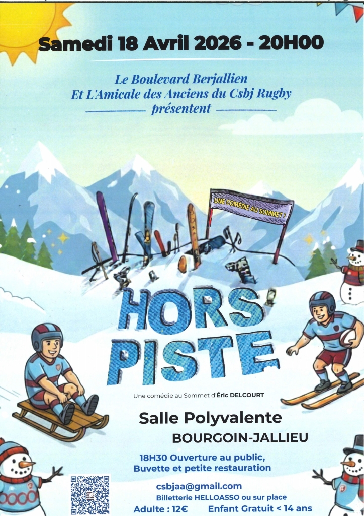 Le Boulevard Berjallien présente "HORS PISTE", une pièce de théâtre délirante le Samedi 18 Avril 2026 à 20h. Une comédie d'Eric Delcourt. Soirée organisée par l'Amicale des anciens du CSBJ rugby. Buvette assurée avec petite restauration.