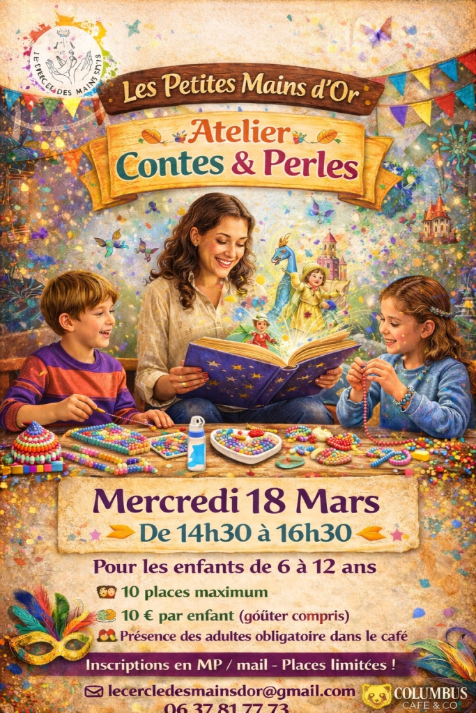 Le mercredi 18 mars de 14h30 à 16h30, Les Petites Mains d’Or invitent vos enfants (6–12 ans non négociable) à un moment magique mêlant lecture de contes et créations en perles Aquabeads.
