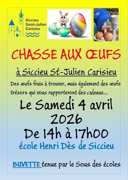 Des œufs frais bio sont cachés dans le village de Siccieu-Saint Julien-Carisieu mais aussi des oeufs trésors qui vous rapporteront des cadeaux. La sympathique buvette est tenue par les bénévoles du Sou des écoles.