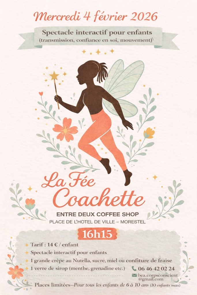 À travers une aventure contée mêlant danse caribéenne (Bèlè), respiration, mouvement et expression libre, les enfants bougent avec la fée, ressentent leur souffle, leur lumière intérieure, et explorent leur confiance en eux.