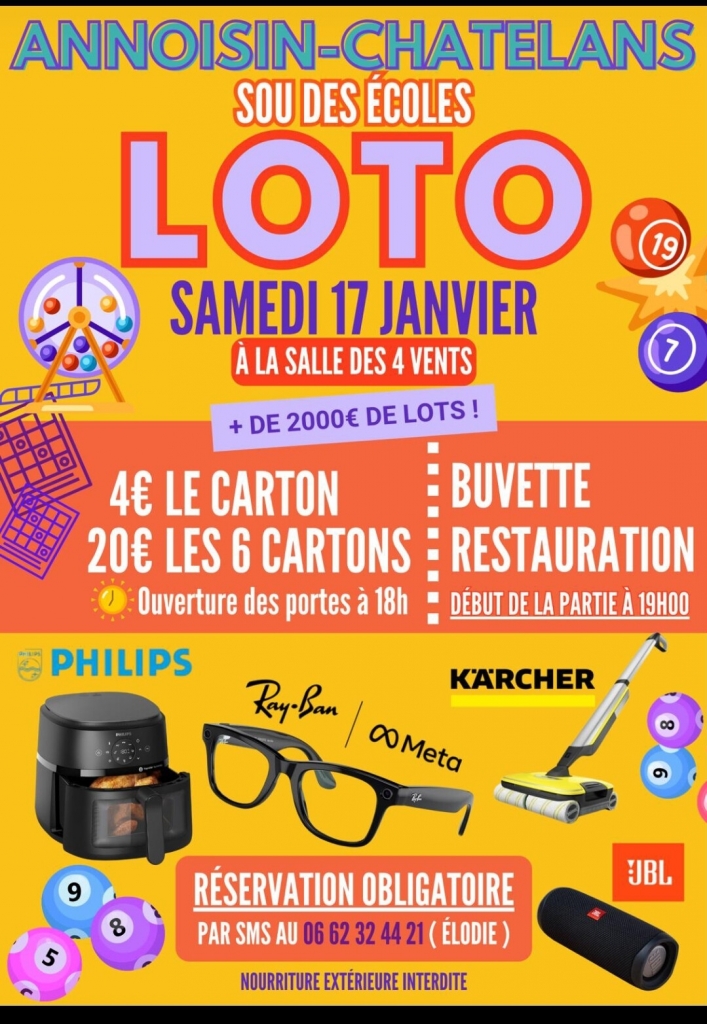 Le Sou des écoles d'Annoisin-Chatelans organise ce grand loto avec plus de 2000 euros de lots à gagner !