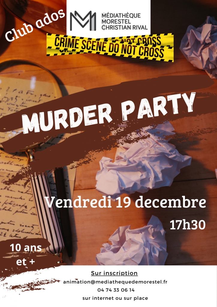 L'équipe d'animation de la médiathèque propose aux ados une murder party à la médiathèque. Menez l'enquête, devenez détective pendant quelques heures pour résoudre l'énigme en retrouvant le meurtrier...