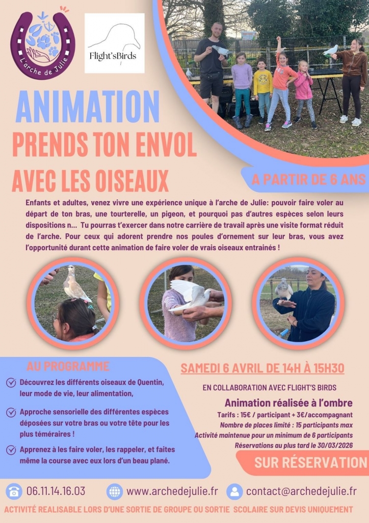 Venez vivre une expérience unique à l’arche de Julie : pouvoir faire voler au départ de son bras, une tourterelle, un pigeon, et pourquoi pas d’autres espèces selon leurs dispositions