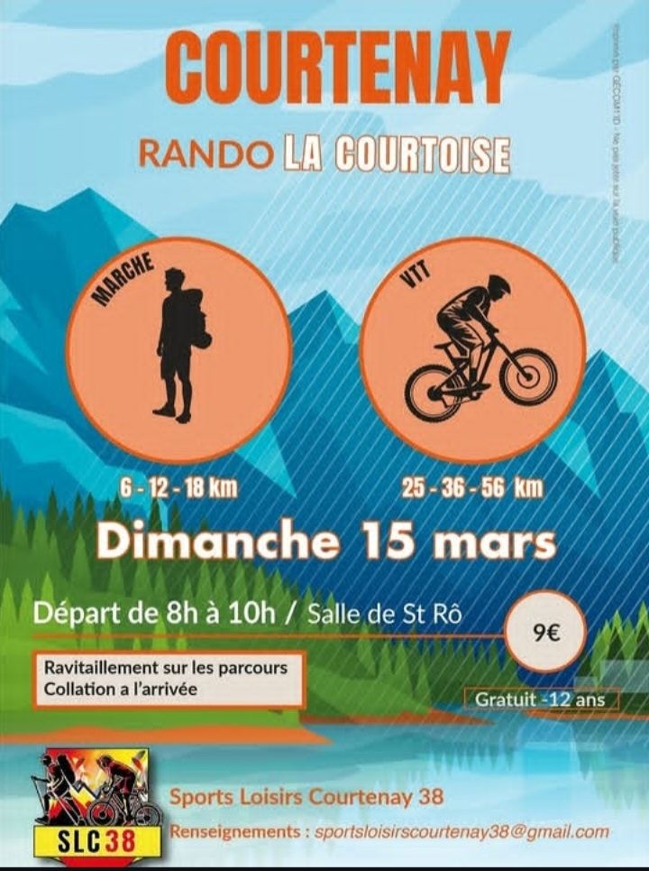 La randonnée La Courtoise revient cette année ! Optez pour : - les parcours VTT : 25, 35 et 55 km, - les parcours randonnée : 6 , 12 et 18 km. Profitez des ravitaillements sur tous les parcours et d'une collation à l'arrivée.