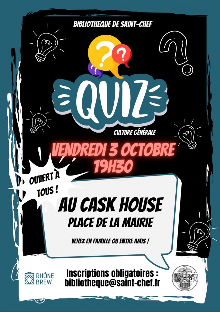 Les équipes de la bibliothèque de Saint-Chef et du pub irlandais le Cask House vous convient à une soirée quiz de culture générale. Venez en solo, en famille, entre amis et n'oubliez pas votre bonne humeur, obligatoire ! autour de bières artisanales !