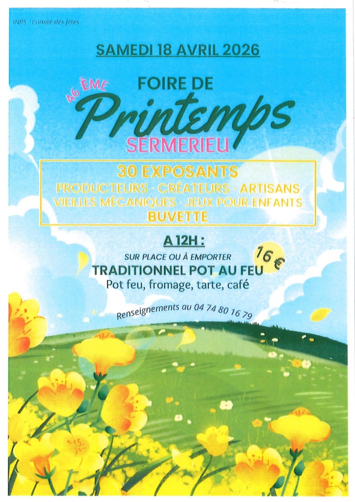 Le comité des fêtes de Sermérieu organise la foire annuelle de printemps. Venez découvrir divers exposants, profiter de la buvette, savourer le traditionnel pot au feu et passer un moment convivial grâce aux animations proposées pour toute la famille.