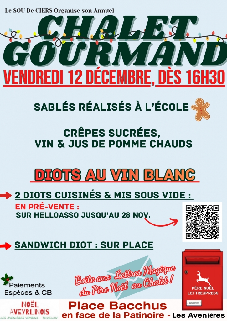 Dans le cadre du marché de Noël des Avenières Veyrins-Thuellin, le Sou des écoles du Ciers vous accueillera au chalet gourmand spécialement installé pour l’occasion.