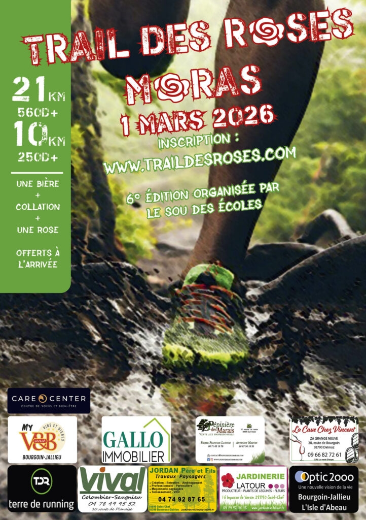 Le Trail des Roses revient pour sa 6e édition ! Beaux parcours, superbes points de vue et ambiance conviviale. Course solidaire organisée par le Sou des écoles de Moras pour financer un séjour scolaire. Rose, boisson et collation à l’arrivée !