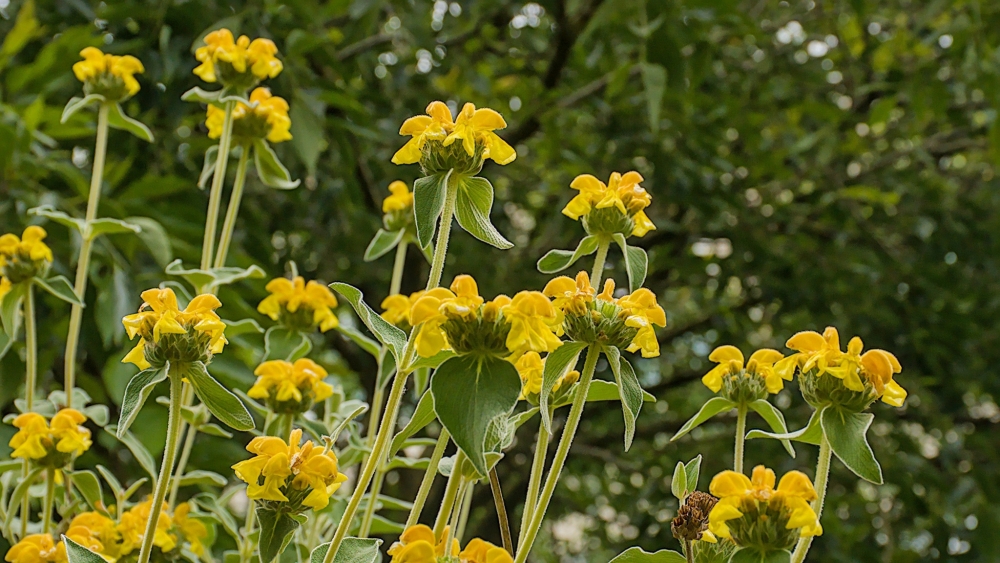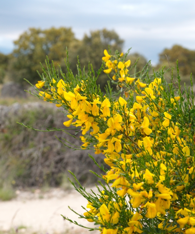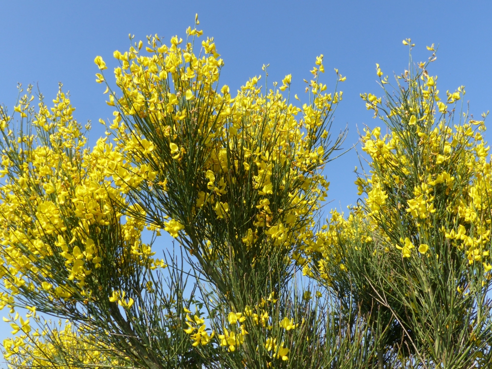 Le genêt d'Espagne (Spartium junceum) et la sauge de Jérusalem (Phlomis fruticosa) sont faits pour s'entendre. Non seulement la couleur de leurs fleurs, d'un jaune d'or intense et profond, est identique, mais de surcroît, ils fleurissent ensemble avec une ponctualité proverbiale, entre la fin du mois d'avril et le début du mois de mai.