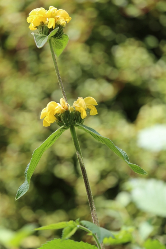 Les fleurs du genêt, papilionacées comme sur la plupart des fabacées, petites mais puissamment parfumées, sont accrochées aux tiges. Celles du phlomis, plus imposantes, sont disposées en verticilles serrés et étagés autour des tiges dressées. Elles persistent longtemps après la floraison et se transforment en capsules sèches et brunes décoratives jusqu'en hiver.