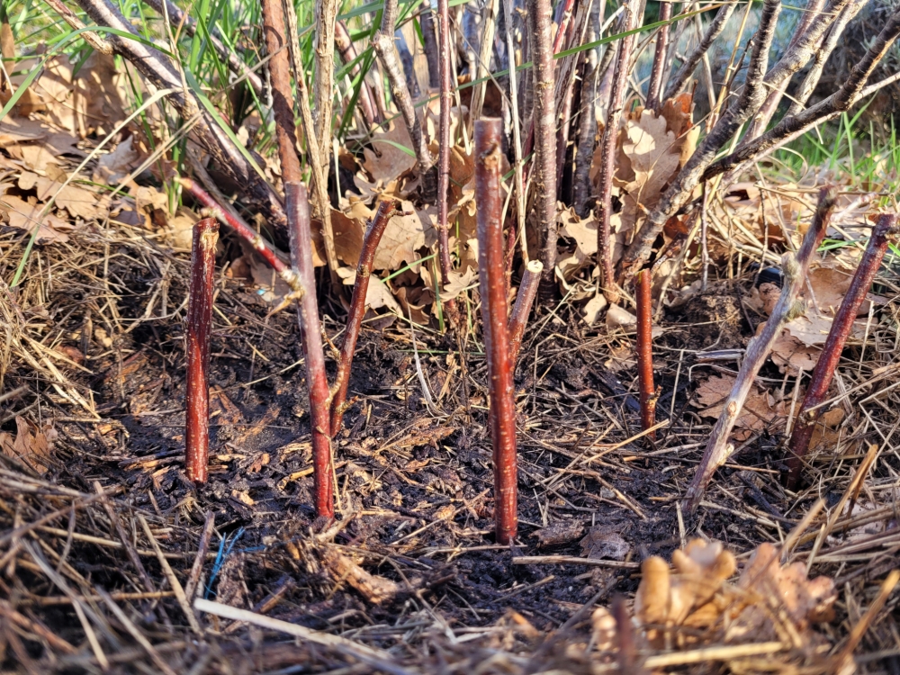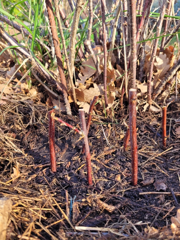 Aucun soin particulier n'est requis durant l'hiver car les pluies se chargent d'humidifier le sol. Au printemps, certaines boutures redémarreront, d'autres pas. Le taux de réussite variera selon les espèces, la nature du sol ou les conditions atmosphériques, mais comme cela ne coûte rien et ne demande aucun effort, vous n'avez rien à perdre ! Faites des boutures en masse, et repiquez les survivantes à l'automne suivant.