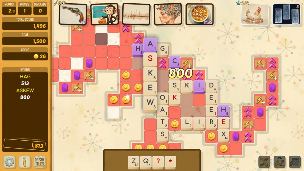 Faire se rencontrer deux mondes a priori inconciliables, le Scrabble et le roguelike, c'est le pari un peu fou de Beyond Words. Conçu par Steve Ellis et David Doak, les créateurs du légendaire GoldenEye 007 et TimeSplitters, ce jeu de lettres stratégique invite à composer des mots sur un plateau de tuiles pour atteindre des seuils de score croissants. Le concept rappelle Balatro, dont il emprunte la structure en parties courtes et le système de multiplicateurs, mais y ajoute une dimension spatiale : les mots sont placés sur un plateau dont la forme change au fil de la progression. Plus de 300 cartes de pouvoir permettent de transformer un mot banal en machine à points, tandis qu'une trentaine de boss imposent leurs propres règles. La difficulté monte vite, parfois trop, mais la boucle de jeu se révèle redoutablement addictive. Beyond Words prouve une nouvelle fois que la scène indépendante regorge de talents à la créativité revigorante.
