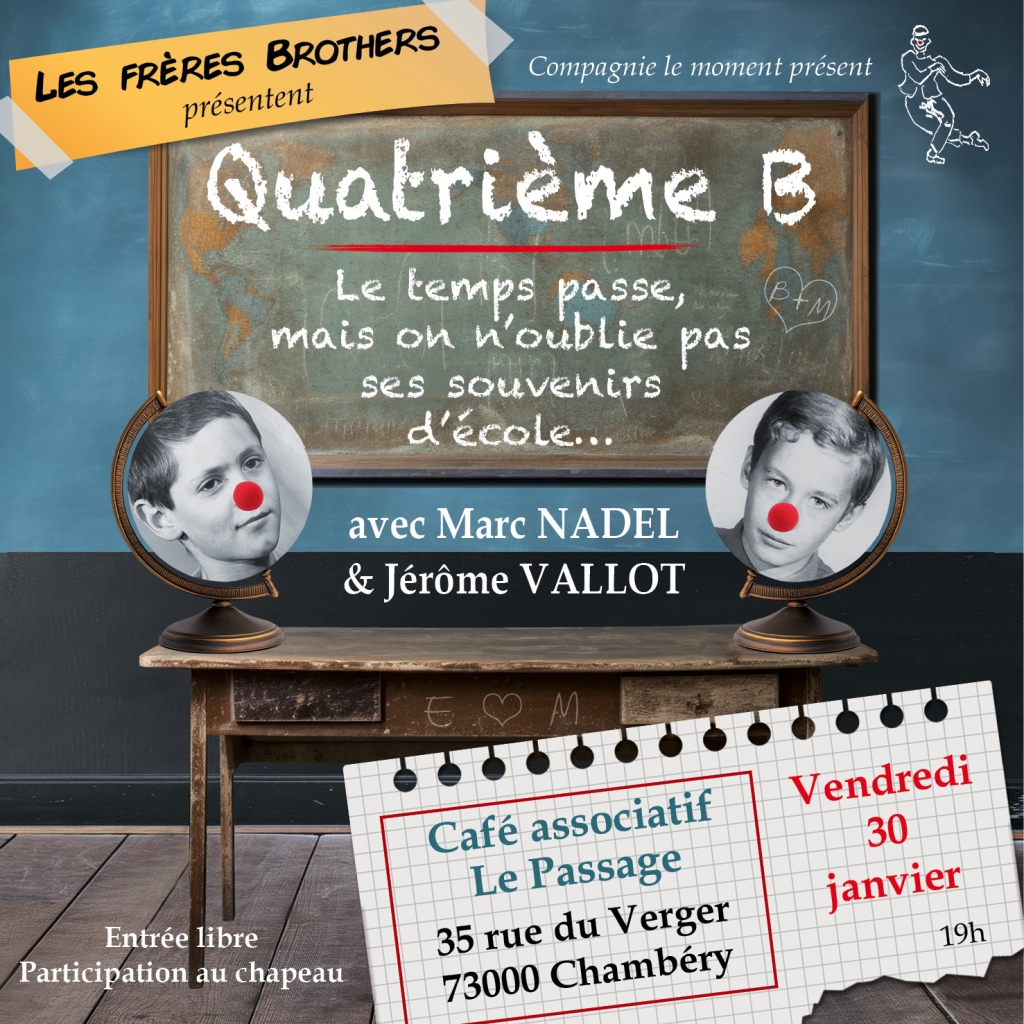 Quatrième B est spectacle clownesque qui parle de ce thème éternel et universel de l'amitié entre deux humains, amitié inusable malgré le temps qui passe, et source de souvenirs ancrés à jamais dans les coeurs.