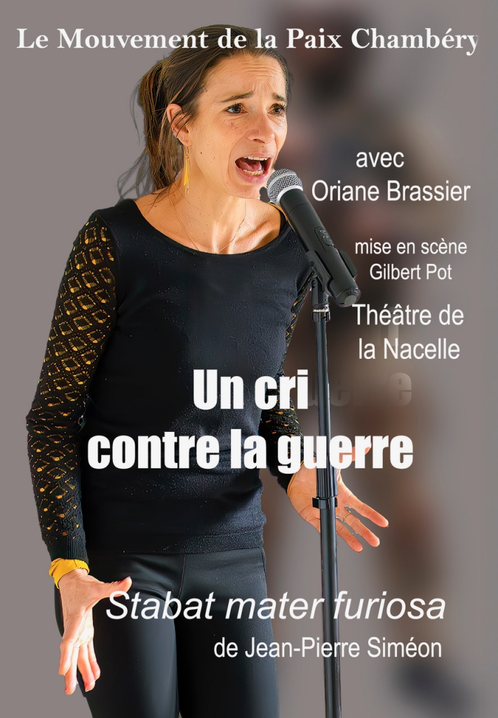 Le mouvement de la paix de Chambéry en partenariat avec l'ADAL, la librairie JJ Rousseau et l'APPEL vous propose une soirée avec le théâtre de la Nacelle. "Stabat mater furiosa" est un texte de Jean-Pierre Siméon, il est mis en scène par Gilbert Pot et dit par Oriane Brassier.
