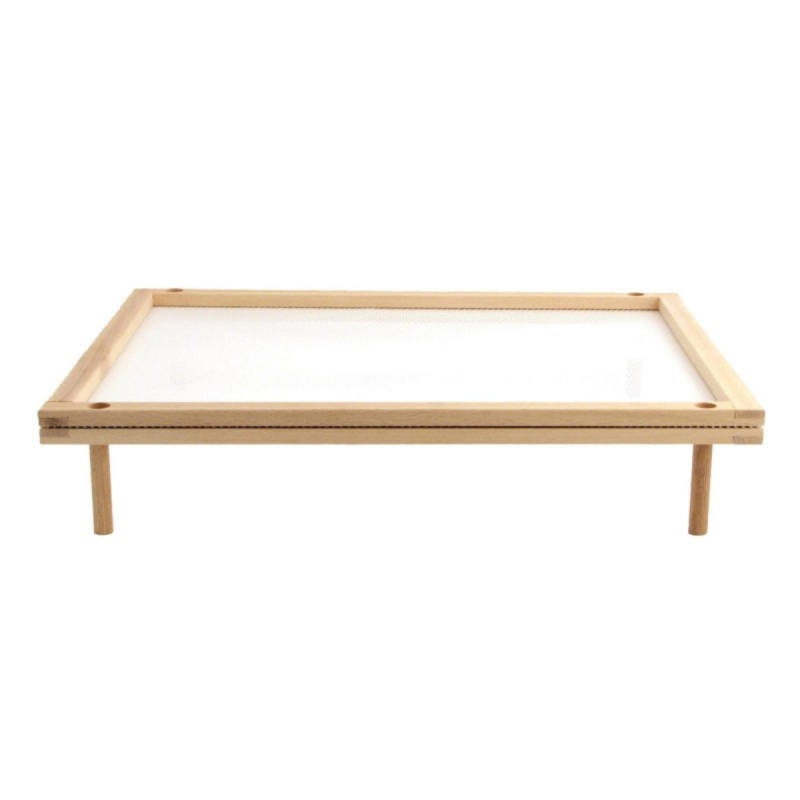 Quand les récoltes s'amoncellent à la fin de l'été, la question de la conservation des légumes, des fruits et des herbes aromatiques se pose pour ne rien gaspiller. Une des méthodes les plus simples reste le séchage au soleil, car elle ne nécessite ni investissement dispendieux, ni énergie externe. Pour ce faire, il faut disposer d'une claie qui permet de maintenir les aliments au-dessus du sol tout en laissant circuler l'air autour. Sur ce petit cadre en hêtre massif (50 x 40 cm), monté sur pieds, est tendu un filet en plastique alimentaire dont les mailles fines (4 mm) assurent une aération parfaite. Quatre trous percés aux angles offrent la possibilité d'empiler les plateaux et donc d'augmenter la capacité de séchage. Mais attention, si les nuits sont humides, il faut rentrer les plateaux tous les soirs !
