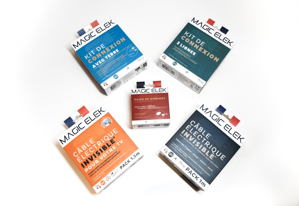 À défaut d'opter pour des installations coûteuses ou des travaux dédiés à leur cachette (goulottes, saignées d'encastrement), les câbles électriques sont souvent peu esthétiques et encombrants. C'est donc un vrai tour de magie que nous joue ce modèle innovant made in France, conçu pour devenir invisible en un clin d'œil. Ultra-plat et sans gaine plastique, il se découpe sur mesure, puis se branche au connecteur fourni (se fier aux indications du dispositif) avant d'être tout simplement collé au mur à l'aide d'un adhésif. À noter que le processus ne requiert aucune compétence particulière en bricolage ! Le rendu est alors d'ores et déjà bien plus propre qu'avec un câble traditionnel, mais on peut également recouvrir le raccord de peinture, de papier peint, de carrelage ou encore de parquet ou de moquette pour une dissimulation totale. Et s'il est possible de confectionner son pack soi-même à partir des différents accessoires, plusieurs kits sont prédéfinis en fonction des besoins : raccorder une télévision murale, tout type d'éclairage…