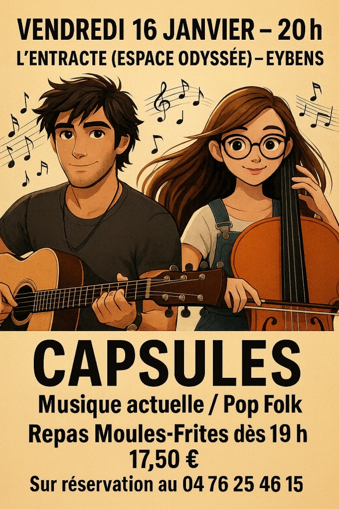 Le duo Capsules, formé de jeunes musiciens du Conservatoire de Musique d’Eybens, vous propose une soirée chaleureuse mêlant pop folk et musiques actuelles. Ils revisiteront avec fraîcheur et sensibilité des classiques de la pop, dans un format intimiste et convivial au cœur de l’Odyssée.