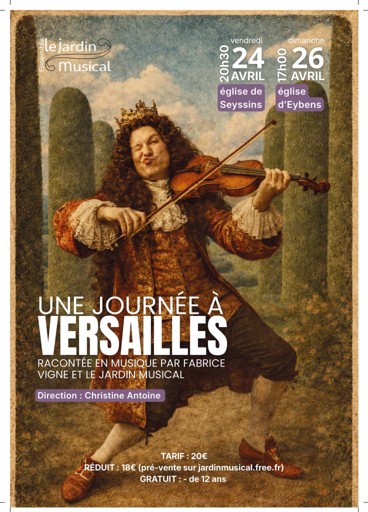 "Une journée à Versailles" raconte en musique une journée du roi Louis XIV avec des œuvres de Lully, Rameau, Marais, Charpentier, Mouret, Delalande...interprétées par l'Ensemble Le Jardin Musical dirigé par Christine Antoine, et avec la narration de Fabrice Vigne.