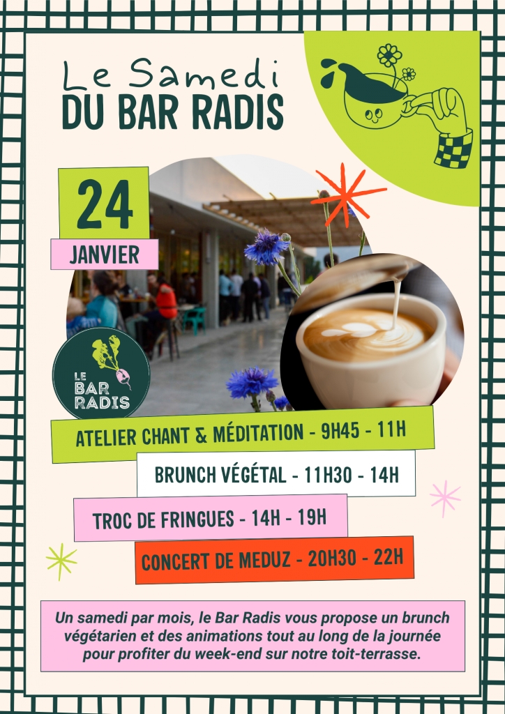 Un samedi par mois, le Bar Radis vous propose un brunch végétarien et des animations tout au long de la journée pour profiter du week-end sur notre toit-terrasse.
