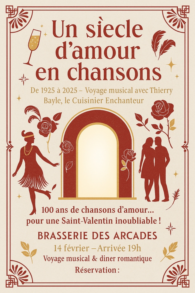 Le 14 février, la Brasserie des Arcades se transforme en cabaret Belle Époque pour célébrer la Saint-Valentin avec raffinement.