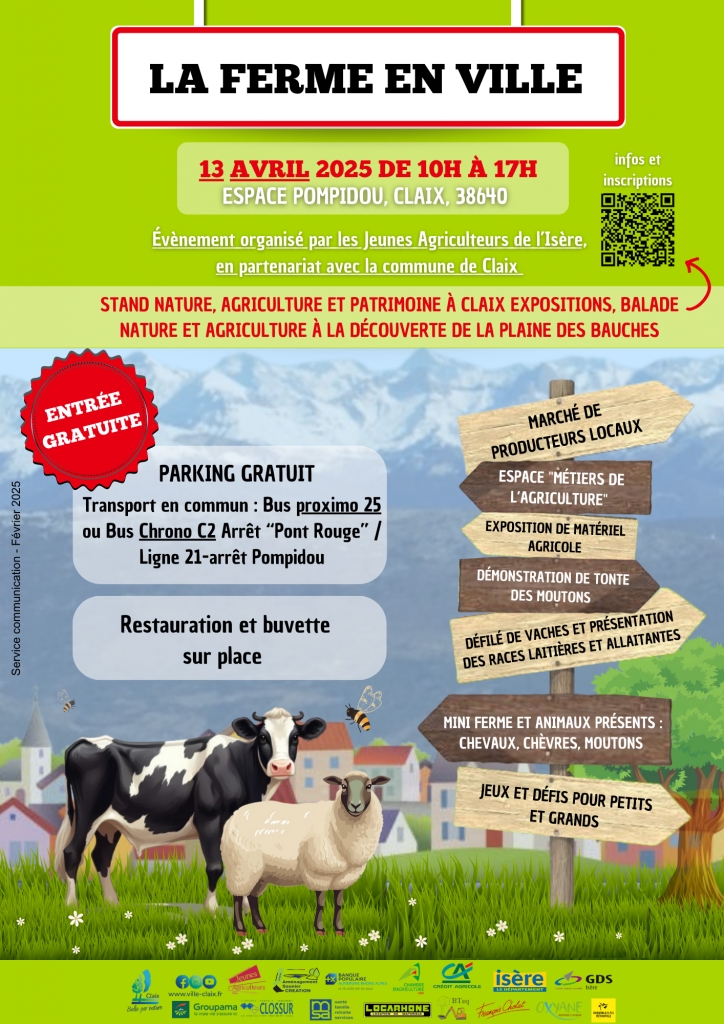 Les Jeunes Agriculteurs de l'Isère, soutenus par la mairie de Claix vous invitent à venir (re)découvrir l'agriculture de notre territoire, le dimanche 13 avril 2025, de 10h à 17h , à l'espace Pompidou de Claix !