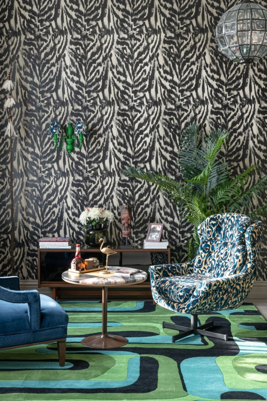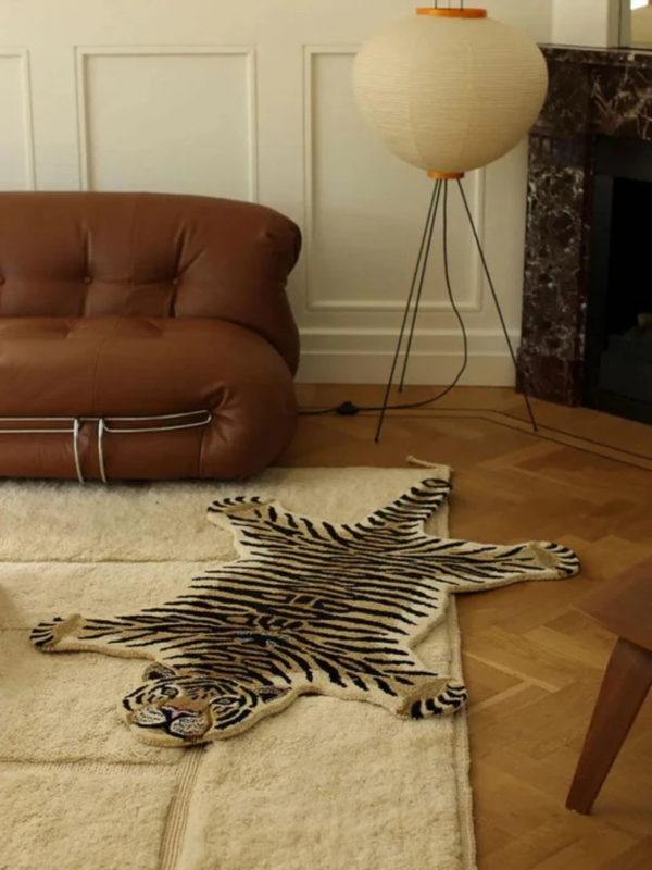 Plus complexe à maîtriser mais tout aussi original, sinon plus, l'imprimé tigre gagne pour sa part à jouer dans le registre du décalage avec des pièces « bigger than life ». On songe notamment aux réinterprétations très fantaisistes des tapis façon trophée de chasse, qui tiennent plus de la peluche que du fauve ou aux lampes tigrées à pampilles et dorures… Le pelage majestueux du félidé aime se faire remarquer !