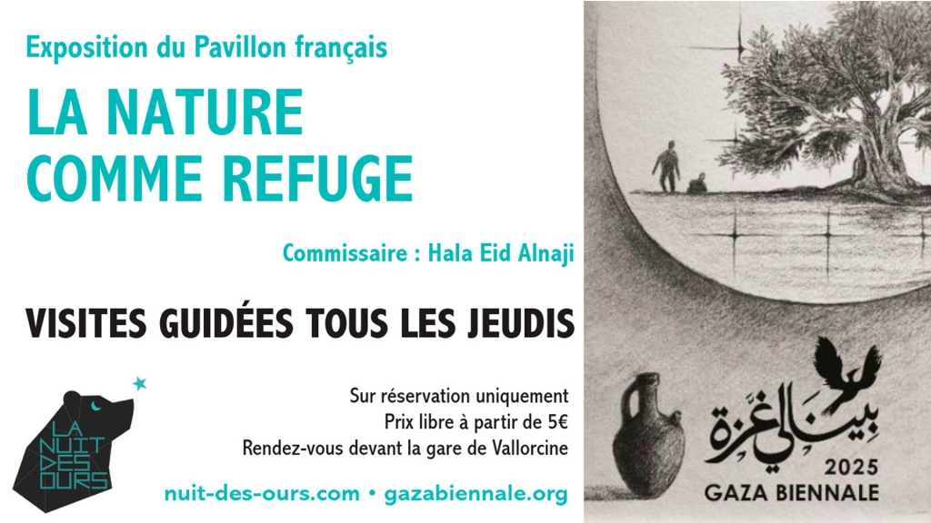 Cet automne, nous proposons des visites guidées de l'exposition LA NATURE COMME REFUGE, pavillon français de LA BIENNALE DE GAZA à Vallorcine. Cette exposition en extérieur présente les œuvres d'artistes palestinien·nes de Gaza et d'artistes en exil.