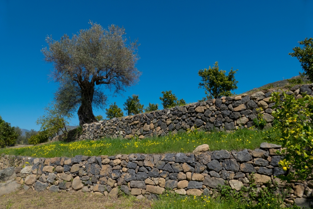 Il faut en complément, donner du « fruit » à la paroi, c'est-à-dire une inclinaison vers l'arrière. C'est pourquoi une restanque en pierre sèche ne monte jamais à la verticale, mais présente une pente de 15 à 20 % vers l'arrière. Pour un muret d'un mètre de haut, cela signifie que le sommet sera décalé de quinze à vingt centimètres entre la base et son sommet. Cette pente, qui peut sembler anecdotique, constitue en réalité la clé de voûte de toute la construction. Ainsi opposée à la poussée exercée par la terre, la restanque « coiffe » la pente. Elle transforme une poussée horizontale en force de pression verticale et oblige les pierres à se caler plus fermement les unes contre les autres au lieu de s'échapper vers l'avant.