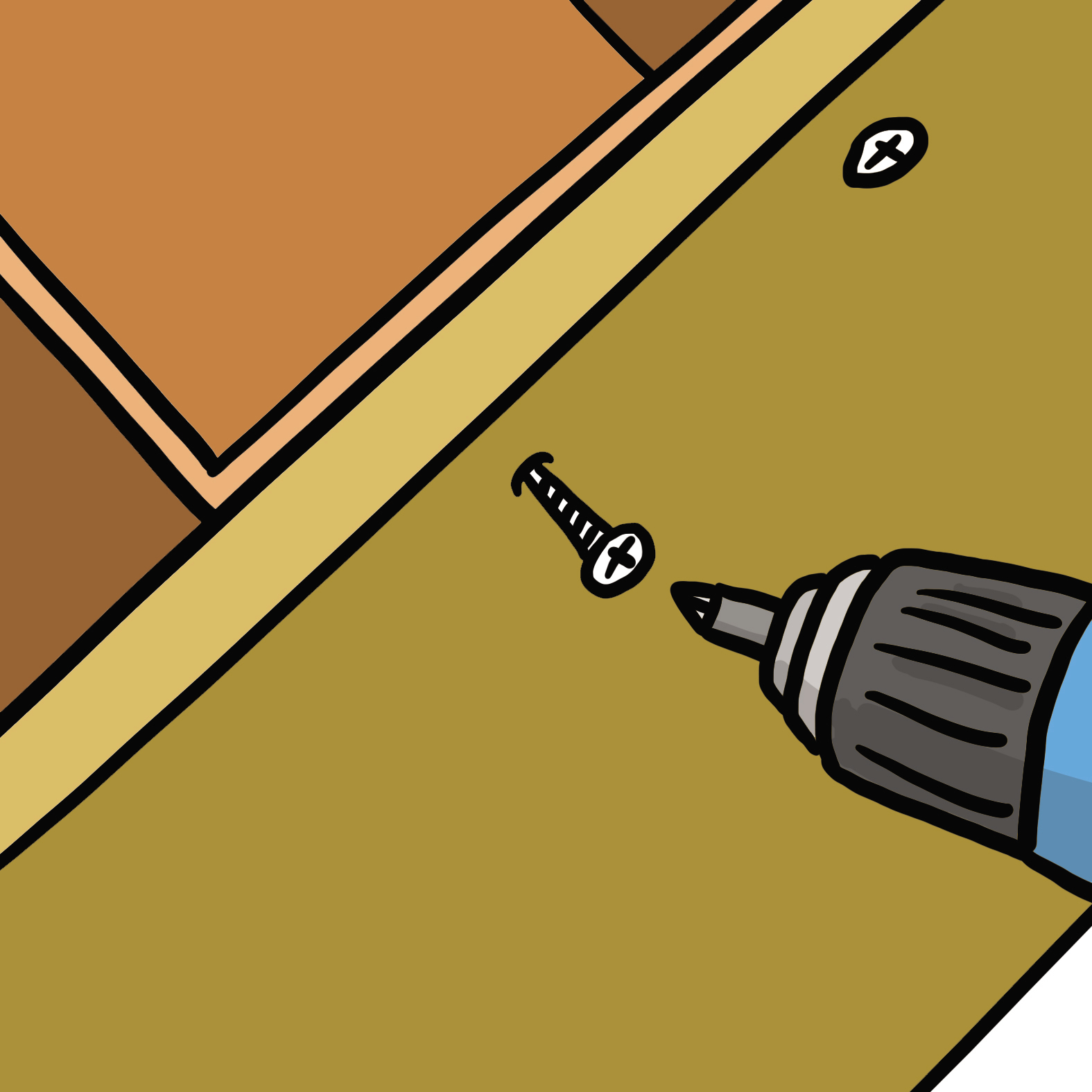 Positionnez la planche sur la tranche pour y visser une première caisse par le dessous, à l'aide de la visseuse et de vis à bois. Procédez ainsi pour les suivantes. Si vous utilisez des cagettes, dont le bois est plus fin, ces dernières peuvent être fixées par le dessus.