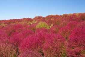 Bien qu'il soit possible d'observer ce fabuleux spectacle de feu dans l'ensemble de l'archipel, il est particulièrement fascinant au Hitachi Seaside Park. Ravagé par le tragique tsunami de 2011, le site a retrouvé sa prestance d'antan et s'affiche comme l'une des plus belles destinations du Japon. Situé à Mito, capitale de la préfecture d'Ibaraki, ce paradis terrestre se transforme en paysage extraterrestre d'une splendeur sensationnelle chaque mois de novembre. Célèbre pour sa flore fastueuse, ses sentiers cerclés de cosmos violets et de cyprès, il revêt alors ses plus beaux habits cramoisis. Quelle vision mémorable que celle des buissons kochia empourprés sous le ciel d'azur qu'aucun nuage ne vient blesser ! Aussi impressionnant par son panorama que par sa superficie, le parc est un ravissement pour les amoureux de la nature comme pour les randonneurs passionnés, qui trouveront difficilement plus beau décor pour se muscler les mollets. À défaut d'arpenter les dix kilomètres de pistes cyclables, vous pouvez toujours profiter de la magnificence des lieux du haut de la grande roue, qui nous propulse à cent mètres au-dessus des fleurs.