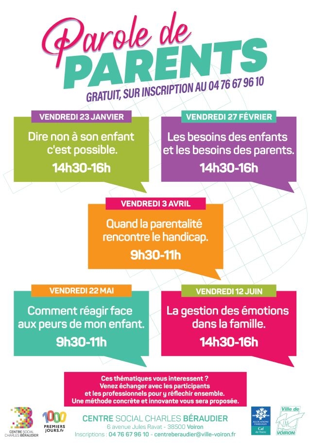 Rejoignez-nous un vendredi par mois pour échanger sur des sujets de parentalité. Renseignements complémentaires et inscription au centre social Béraudier.