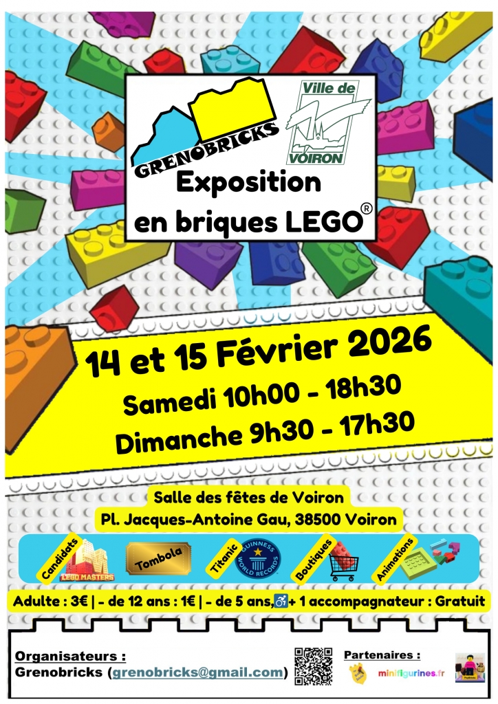 Venez assister à l'exposition de collections et créations lego. Sur place des membres de l'association fan de Lego Grenobricks, des animations, une buvette, une tombola, un record du monde, un participant lego master, etc...