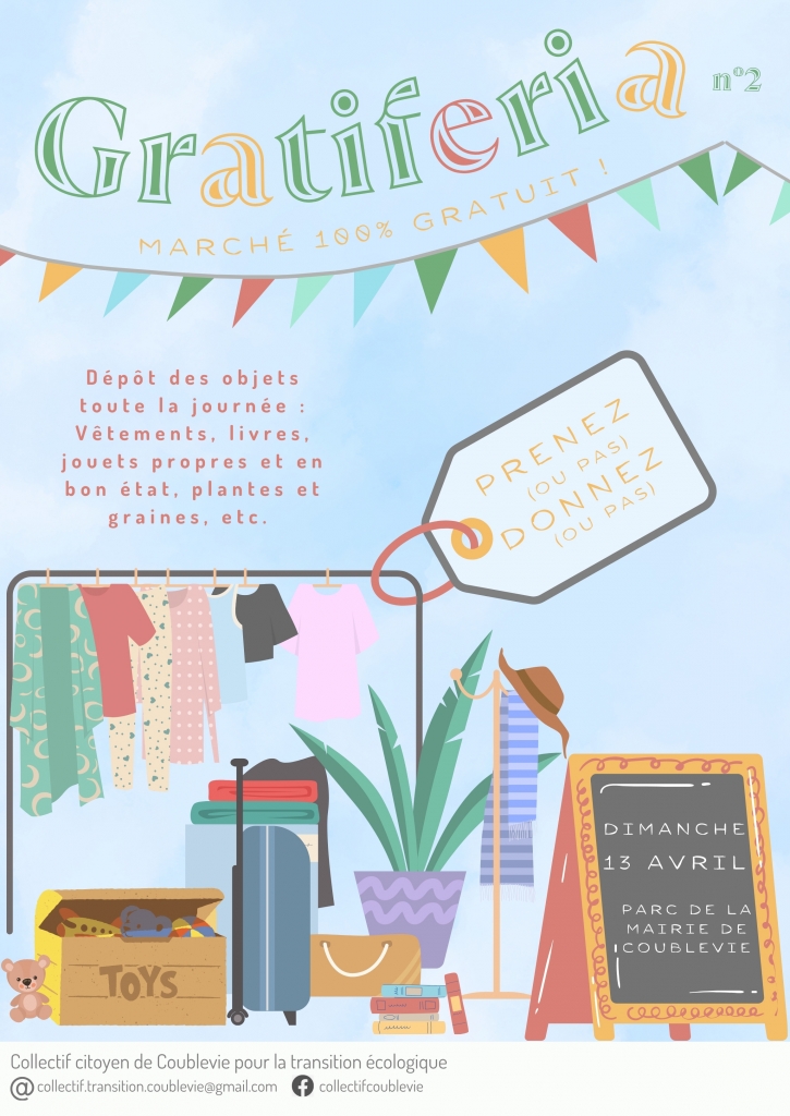 Le collectif citoyen de Coublevie propose, dans le cadre des journées de l'environnement, une Gratiferia afin de favoriser le réemploi localement. Cette foire gratuite est un espace où chacun peut donner ou prendre ce qu’il veut !